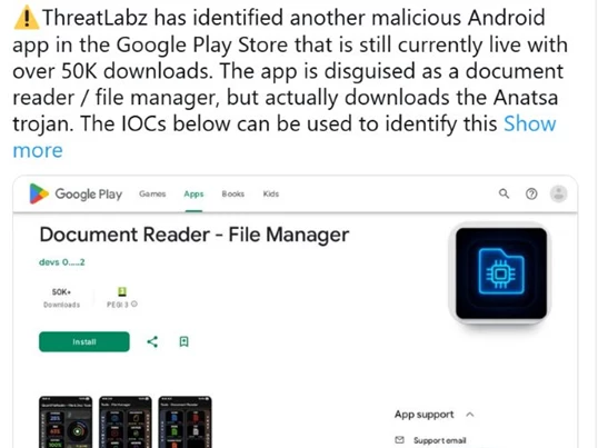 DNVN - Một mối đe dọa an ninh mạng mới vừa được phát hiện trên Google Play Store, nơi một ứng dụng lừa đảo ngụy trang dưới vỏ bọc trình đọc tài liệu và quản lý tập tin để tấn công tài khoản ngân hàng của người dùng.