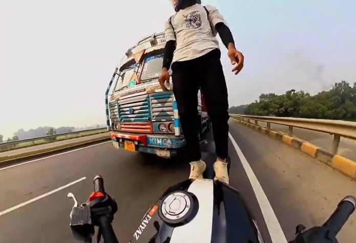 DNVN - Một nam thanh niên tại Ấn Độ suýt mất mạng khi liều lĩnh đứng lên yên xe mô tô chạy tốc độ cao ngay trước đầu xe tải. Cú va chạm bất ngờ khiến anh ngã văng xuống đường, may mắn chỉ bị thương nhẹ.