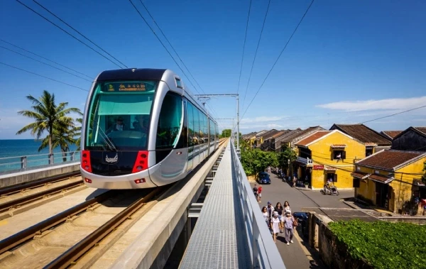 Tuyến đường sắt đô thị Đà Nẵng – Hội An dự kiến sẽ rút ngắn thời gian di chuyển xuống còn 20 phút (Ảnh minh họa bằng AI).