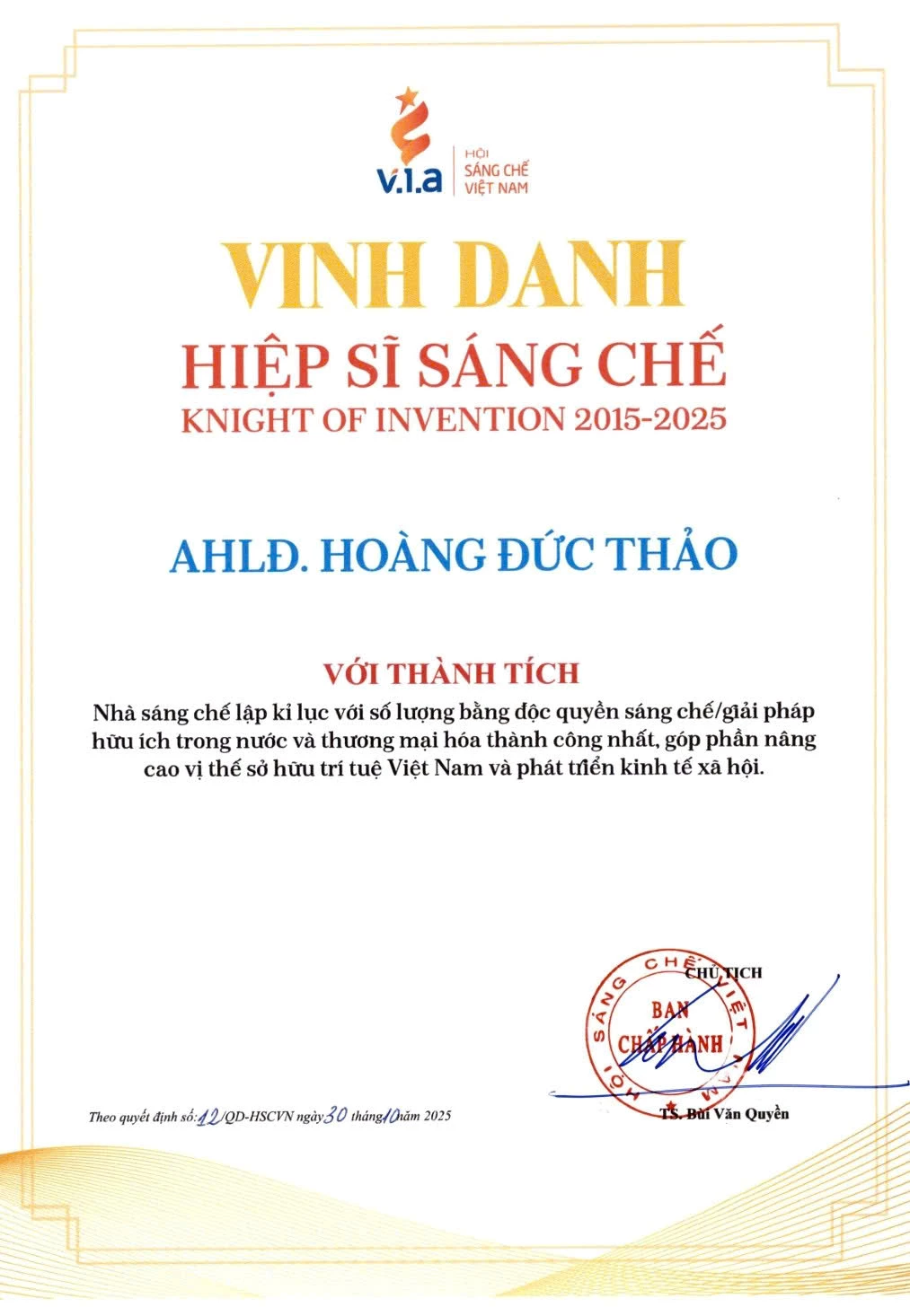 Danh hiệu “Hiệp sĩ Sáng chế – Knight of Invention 2015–2025” vinh danh GS-TS-VS danh dự, AHLĐ Hoàng Đức Thảolà Nhà sáng chế lập kỷ lục với số lượng bằng độc quyền sáng chế/giải pháp hữu ích trong nước và thương mại hóa thành công nhất, góp phần nâng cao vị thế sở hữu trí tuệ Việt Nam và phát triển kinh tế xã hội.