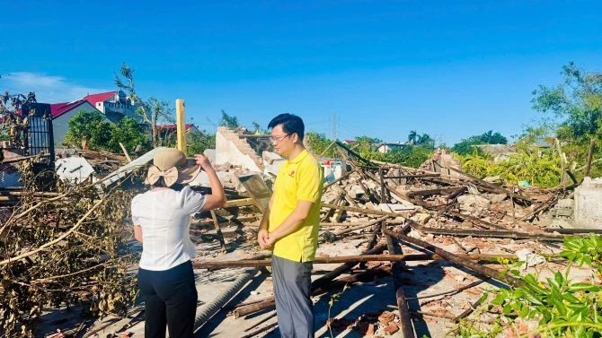Đại diện Quỹ Thiện Tâm khảo sát hỗ trợ người dân sập nhà tại Nghệ An sau bão số 11.