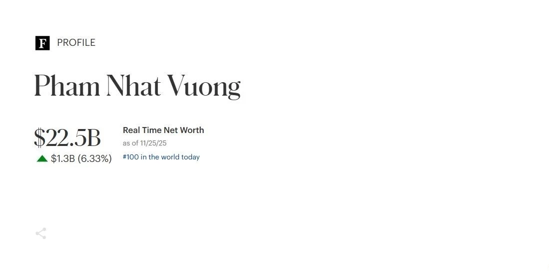 Tài sản của ông Phạm Nhật Vượng chạm ngưỡng 22,5 tỷ USD ngày 25/11