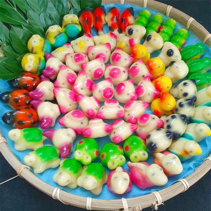 Bánh trái cây đậu xanh với tạo hình đẹp mắt, màu sắc tươi sáng, là món ăn vặt quen thuộc với tuổi thơ nhiều thế hệ Sài thành. Đường Lê Văn Sỹ (quận 3) là địa chỉ để bạn tìm mua món ngon này. Thực khách Thanh Thảo chia sẻ: "Bánh đậu xanh ngoài hình trái cây, nay còn có dạng các con thú đáng yêu. Bánh được tạo hình khá to, bên trong nhân có nho khô giúp chống ngấy. Mình có dịp ăn lại vẫn ghiền như hồi nhỏ". Mức giá từ 90.000 đồng/hộp. Ảnh: Banhtraicaydauxanhchausg.