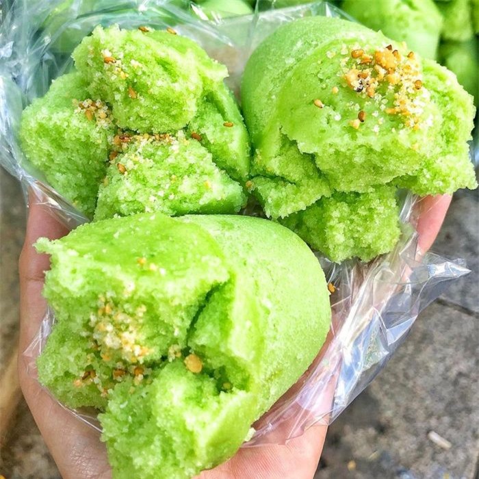 Bánh bò lá dứa dạng bông xốp, vị ngọt thanh cũng là gợi ý không thể bỏ qua nếu bạn muốn nhâm nhi món ăn chơi của tuổi thơ. Miếng bánh đầy đặn, thơm lá dứa, thêm tí muối mè phù hợp nạp năng lượng buổi sáng. Bạn có thể tìm mua bánh trước cổng Nhà Văn hóa Sinh viên (quận 3) trong khoảng từ 6-10h mỗi ngày. Ảnh: Ansapsaigon.