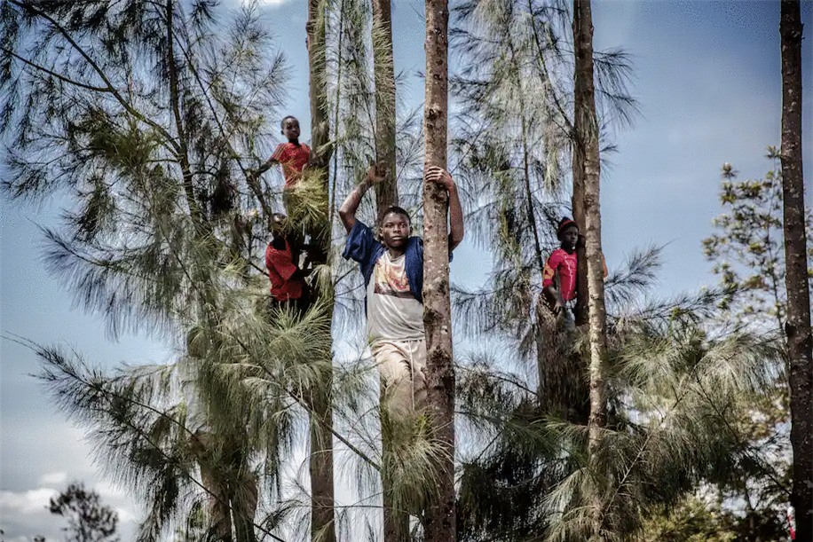 Những đứa trẻ trèo lên cây để quan sát đám tang của Litali từ xa. Ảnh: Washington Post.