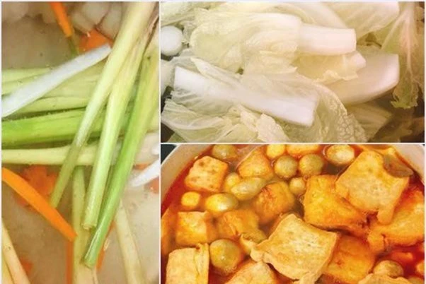 Trên một bếp khác bạn nấu nước với 8 cây sả đập dập và cà rốt, củ cải, cải thảo. Bạn có thể cho thêm su su, mía, củ sắn (miền Bắc gọi là củ đậu)... chủ yếu là để lấy nước ngọt từ rau củ. Bước này nên chuẩn bị trước. Sau đó cho nấm đã xào, đậu hũ đã chiên vào, cho thêm sa tế nữa, bắt đầu nếm lại. Bạn có thể cho thêm muối, bột ngọt, đường phèn sao cho vừa khẩu vị, chú ý nêm đậm một chút để khi chan bún là vừa.