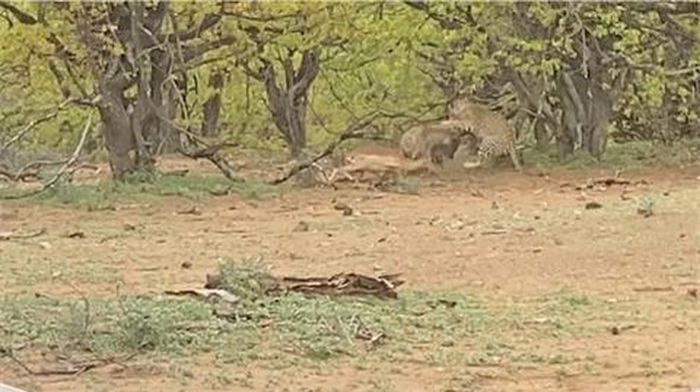 Cả báo hoa mai và linh cẩu cùng xuất trận tranh nhau con mồi