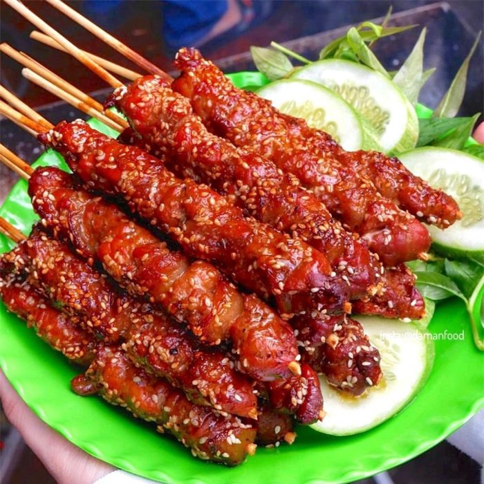 Thịt xiên nướng mè ăn kèm rau răm, dưa leo là phiên bản ẩm thực đường phố được giới trẻ ưa chuộng. Tài khoản Damanfood cho biết: "Mỗi xiên thịt gồm phần nạc, mỡ xen kẽ chỉ 10.000 đồng. Món ăn được tẩm ướp đậm đà, nướng vừa tới và không bị khô". Đường Tân Sơn Nhì (quận Tân Phú) là điểm hẹn để bạn nhâm nhi món ngon này. Ảnh: Damanfood.
