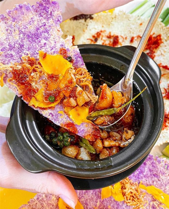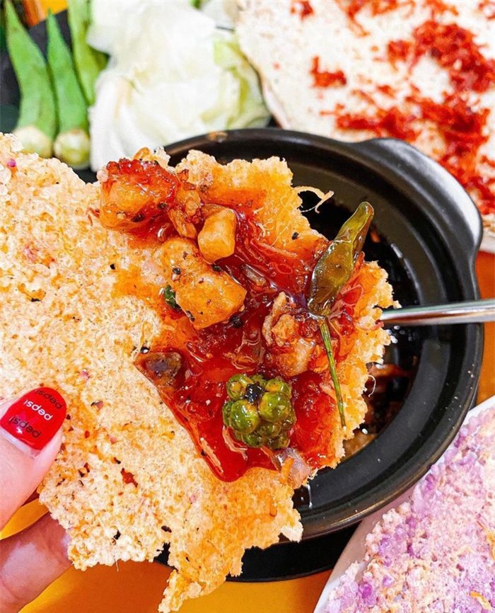 Cơm cháy giòn rụm, thơm phức là món ăn phù hợp để lai rai cùng người thân, bạn bè vào buổi chiều tối. Hàng cơm cháy ở Bờ Bao Tân Thắng (quận Tân Phú) tạo ấn tượng với thực khách bằng kiểu cơm cháy có sắc màu lạ mắt. Tại đây, bạn có cơ hội nhâm nhi cơm cháy thoảng vị gấc, nếp cẩm hoặc lá dứa kết hợp chà bông, khô bò, trứng muối. Điểm nhấn là mắm kho quẹt ăn kèm đậm đà. Một phần có giá từ 25.000 đến 75.000 đồng. Ảnh: Citastyfood.