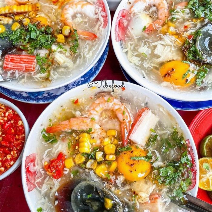 Súp cua là món ngon hút khách bậc nhất ở Sài thành. Một chén thập cẩm gồm óc heo, tôm, trứng bắc thảo, lòng đỏ trứng gà... giúp bạn lấy lại năng lượng sau một ngày dài. Phần ăn thơm ngon, nóng hổi được tiệm súp ở Xóm Chiếu (quận 4) bán với giá 45.000 đồng. Ảnh: Tebefood.