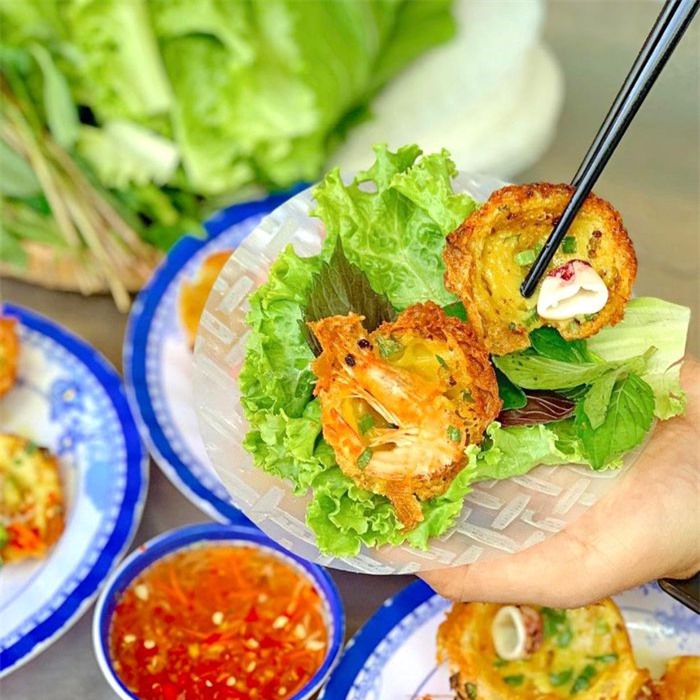 Bánh khọt tại tiệm ở Xóm Đất (quận 11) có nhân phong phú gồm trứng cút, tôm, mực, thịt bằm. Tài khoản Biteallfood chia sẻ: "Bánh được bán theo phần 6 cái với giá 20.000 đồng. Vỏ bánh giòn rụm, hơi nhiều dầu. Khi thưởng thức, thực khách dùng bánh tráng cuốn bánh khọt và rau, rồi chấm nước mắm chua ngọt". Ảnh: Biteallfood.