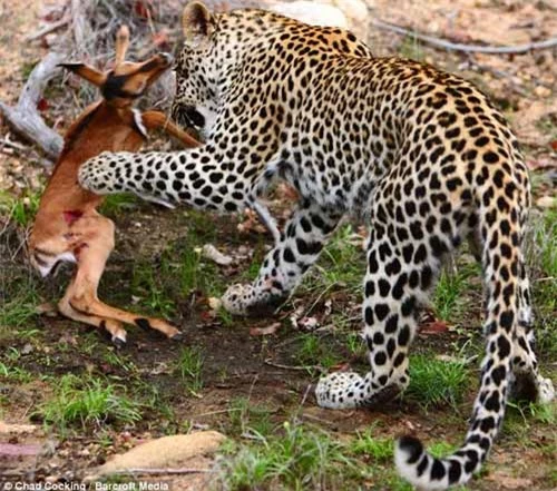 Cảnh tượng đã được Chad Cocking, một nhân viên bảo tồn động vật, ghi lại được trong vườn quốc gia Kruger ở Nam Phi. Sau khi bắt được một con linh dương nhỏ, con báo hoa đã quyết định không ăn thịt ngay mà chơi trò “mèo vờn chuột” với con mồi.
