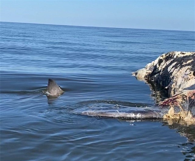Mùi thịt thơm từ xác con cá voi đã dẫn dụ theo rất nhiều loài thú săn mồi kéo đến, trong đó có thể kể đến cá mập trắng lớn, cá mập hổ, cá mập cát, cá ngừ vây xanh... Khung cảnh không khác gì một bữa tiệc buffet thịt cá voi ngoài trời với khách mời là đủ các loài cá ăn thịt khét tiếng dưới đại dương.