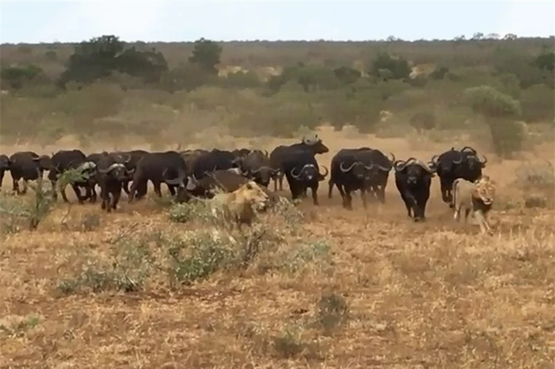 Thấy con trâu rừng đang kiếm ăn một mình, 2 con sư tử đã lao tới tấn công. Những tưởng, loài động vật móng guốc có sừng sẽ bỏ mạng trước nanh vuốt của “lãnh chúa vùng đồng cỏ” thì bất ngờ bầy đàn của nó đã xuất hiện.