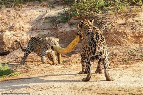 Trong thế giới động vật, câu chuyện mẹ hy sinh tính mạng bảo vệ con không hiếm nhưng cũng có những lần mẹ dạy con cạnh tranh giành thức ăn và xử lý con mồi. Câu chuyện giữa hai mẹ con báo đốm dưới đây là một ví dụ. Hai mẹ con báo đốm cùng tha xác con trăn Anconda qua sông.