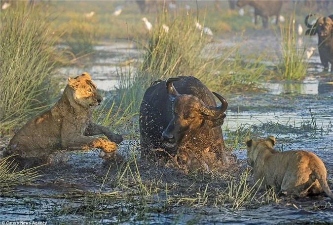 Sư tử lảng vảng chờ cơ hội tấn công đàn trâu rừng trong khu bảo tồn động vật hoang dã Okavango ở Botswana. Nhưng nó không ngờ phải giáp mặt với một con trâu rừng hung hãn. (Nguồn: Daily Mail)