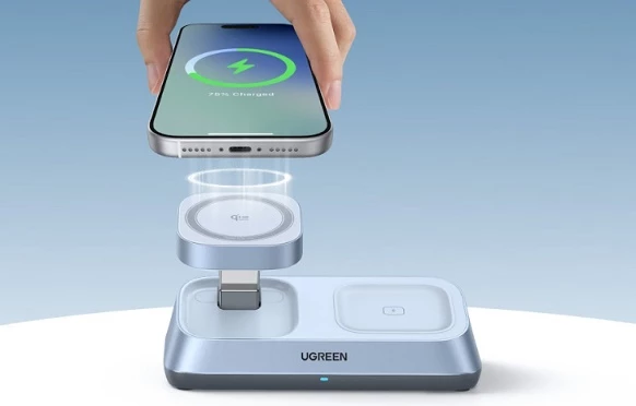 Sạc không dây từ tính để bàn 3 trong 1 MagFlow 25W mang đến khả năng sạc Qi2 ổn định với chân đế chắc chắn và giá đỡ có thể điều chỉnh nghiêng 70°. Sản phẩm hỗ trợ sạc đồng thời iPhone, Apple Watch và AirPods, cho phép người dùng vừa sạc vừa xem video hoặc dùng bản đồ một cách thuận tiện. Hệ thống quản lý nhiệt tiên tiến đảm bảo an toàn, tiết kiệm không gian, lý tưởng cho gia đình hoặc văn phòng.