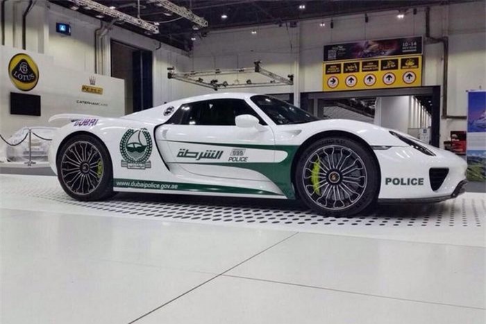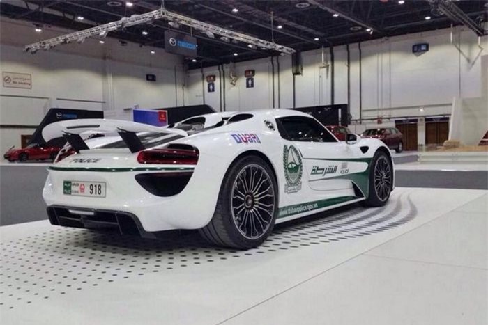 Cuối năm 2015, cảnh sát Dubai "kết nạp" siêu xe hybrid Porsche 918 Spyder vào dàn xe tuần tra. 918 Spyder được ra mắt vào năm 2013, là mẫu siêu xe hybrid đầu tiên của Porsche. Mẫu xe này được sản xuất với số lượng 918 chiếc, kèm mức giá gần 1 triệu USD. Hiện tại, chiếc 918 Spyder đã qua sử dụng có giá không dưới 1,3 triệu USD. Ảnh: Techmicrobio.