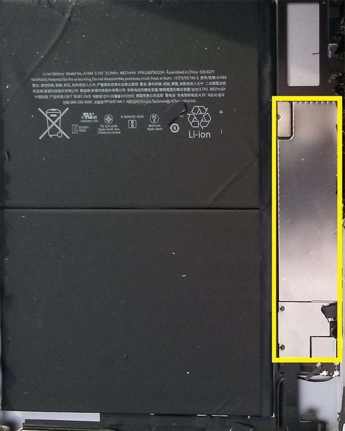 Sau khi tháo màn hình, bạn sẽ thấy pin của iPad cùng một lớp vỏ kim loại ở bên cạnh, nơi chứa logic board của iPad và chip nhớ. Bạn hãy tháo tất cả vít giữ, cáp kết nối, đồng thời tháo nắp bo mạch.