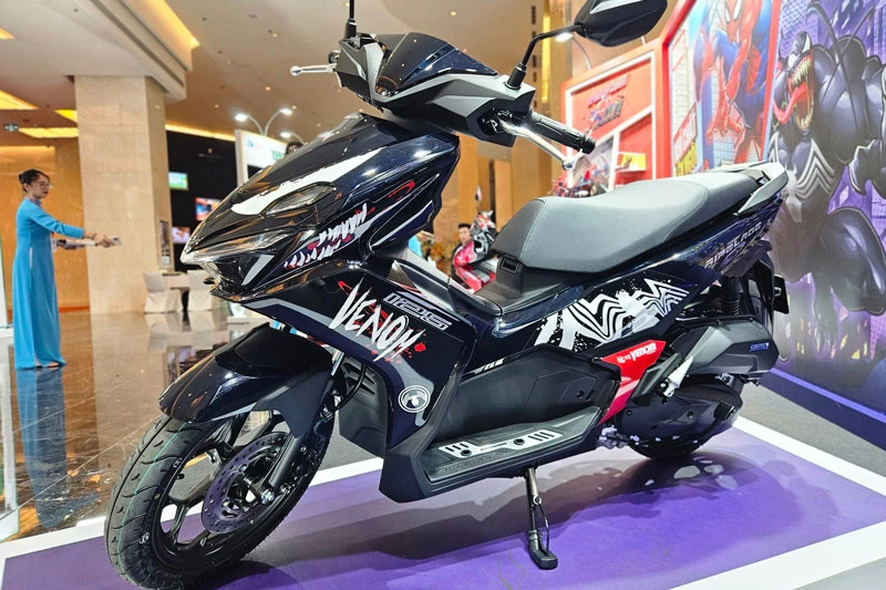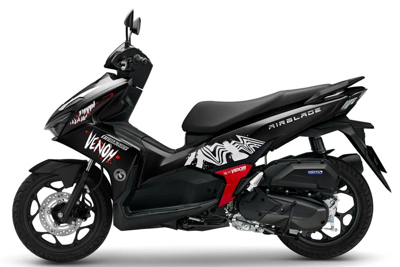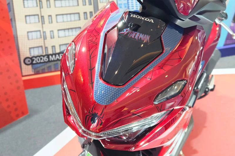 Về thiết kế, phiên bản Spider-Man gây ấn tượng với tông màu đỏ chủ đạo kết hợp các mảng xanh và đen, gợi nhớ bộ trang phục đặc trưng của nhân vật “Người Nhện”. Trên thân xe xuất hiện nhiều họa tiết mô phỏng mạng nhện cùng biểu tượng Spider-Man nổi bật, mang đến diện mạo trẻ trung và đầy năng lượng. Trong khi đó, phiên bản Venom lại mang phong cách mạnh mẽ và bí ẩn hơn với màu đen làm tông nền chủ đạo. Phần yếm trước được trang trí đồ họa mô phỏng gương mặt của nhân vật phản anh hùng Venom, kết hợp với các chi tiết tem trắng và đỏ tạo sự tương phản nổi bật dù tổng thể sử dụng gam màu tối.