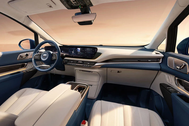 Khoang lái Buick Century Green Edition được trang bị màn hình cong 6K kích thước 30 inch, vô-lăng đa chức năng 4 chấu và hộp tỳ tay tích hợp tủ lạnh nén 4,3 lít.