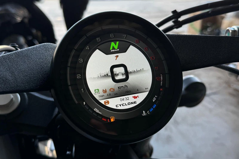 Cyclone RA600 sử dụng bộ bánh 16 inch cho cả trước và sau, đi kèm lốp có kích thước 130/90 ở bánh trước và 150/80 ở bánh sau, giúp xe giữ được dáng vẻ đầm chắc đúng chất cruiser. Xe có trọng lượng 198 kg, chiều cao yên 725 mm, tương đối thân thiện với người lái châu Á, trong khi bình xăng dung tích 14,5 lít đáp ứng tốt nhu cầu di chuyển hằng ngày lẫn các chuyến đi xa cuối tuần.