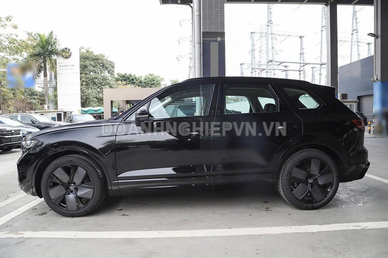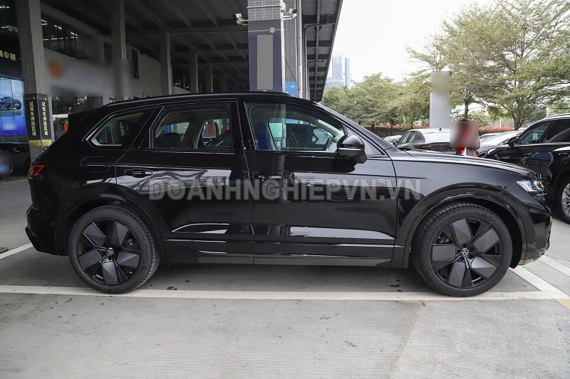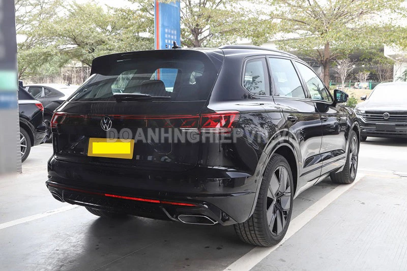 Về ngoại hình, Volkswagen Touareg 3.0TSI R-Line Edition sử dụng gói R-Line màu đen, lược bỏ phần lớn chi tiết mạ crôm và chỉ giữ lại viền crôm tinh tế ở logo cùng cụm ống xả kép. Cản trước và cản sau được sơn đen đồng bộ, kết hợp lưới tản nhiệt dưới dạng tổ ong, tạo cảm giác mạnh mẽ và đậm chất thể thao.
