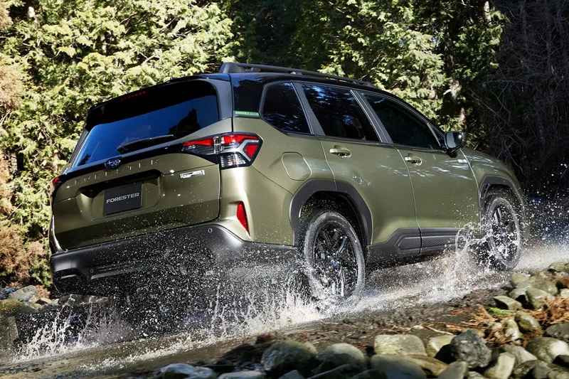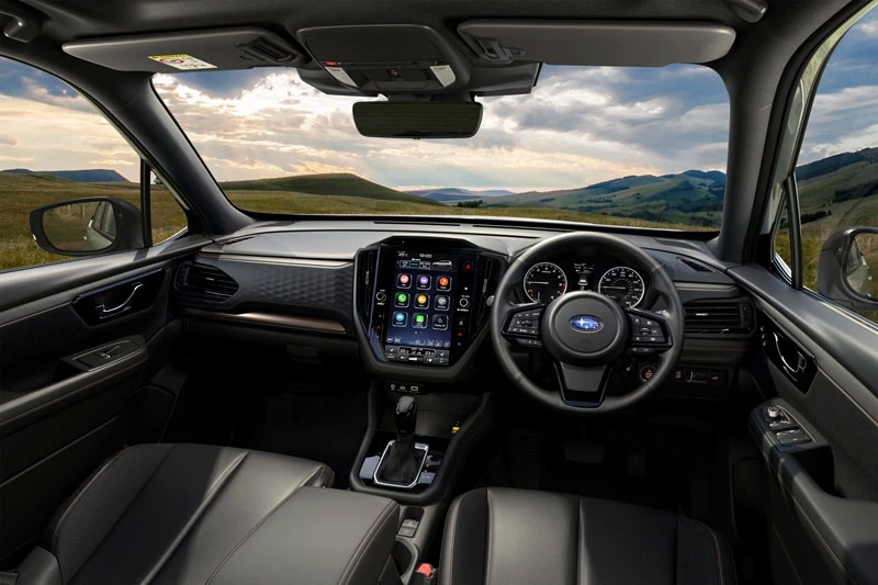 Forester 2026 có kích thước dài 4.656 mm, rộng 1.830 mm, cao 1.730 mm, chiều dài cơ sở 2.670 mm, khoảng sáng gầm 220 mm, cho phép lội nước sâu tới 50 cm. Nội thất sử dụng da đen kết hợp da lộn Ultra-Suede cao cấp. Ghế lái chỉnh điện 10 hướng có hỗ trợ thắt lưng và nhớ 2 vị trí, ghế phụ chỉnh điện 8 hướng. Hàng ghế sau gập/ngả linh hoạt 60:40 và có tính năng gập phẳng One-Touch, tăng dung tích khoang hành lý từ 504 lít lên 1.727 lít.