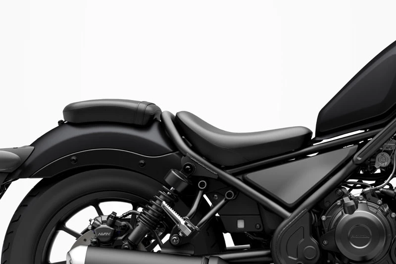 Xe sử dụng bộ mâm 16 inch cho cả hai bánh, đi kèm lốp trước kích thước 130/90 và lốp sau 150/80, mang lại phong cách cruiser đặc trưng cùng độ ổn định khi chạy đường dài. Chiều cao yên của Rebel 500 chỉ ở mức 690 mm, khá thân thiện với nhiều đối tượng người lái, đặc biệt là người mới làm quen với mô tô phân khối lớn. Trọng lượng xe ở mức khoảng 190 kg và bình xăng dung tích 11,2 lít.