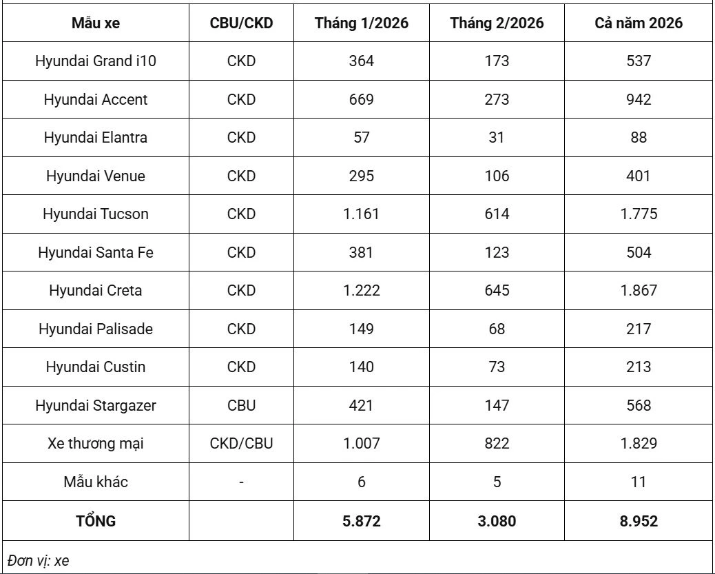 Tính chung hai tháng đầu năm 2026, tổng lượng xe Hyundai bán ra trên toàn thị trường đạt 8.952 chiếc. Trong đó, Hyundai Creta tiếp tục tạm thời dẫn đầu với 1.867 xe bán ra, theo sau là Hyundai Tucson với 1.775 xe. Mẫu sedan Hyundai Accent ghi nhận doanh số cộng dồn 942 xe sau hai tháng đầu năm. Đối với nhóm xe thương mại, tổng lượng bán ra đạt 1.829 xe trong cùng giai đoạn.