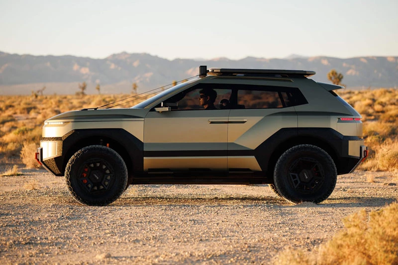 Hyundai Crater sở hữu ngoại thất mạnh mẽ lấy cảm hứng từ robot Mecha, thể hiện qua những đường nét cứng cáp, hệ thống đèn pha địa hình, dây bảo vệ thân xe và bộ lốp địa hình 33 inch. Điểm nhấn lạ mắt nằm ở móc kéo phía trước được tạo hình như một robot mini - chi tiết mà Hyundai gọi là Crater Man. Đây không chỉ là một chi tiết vui nhộn mà còn là cách hãng thêm yếu tố nhân văn cho mẫu xe mang phong thái hầm hố này.