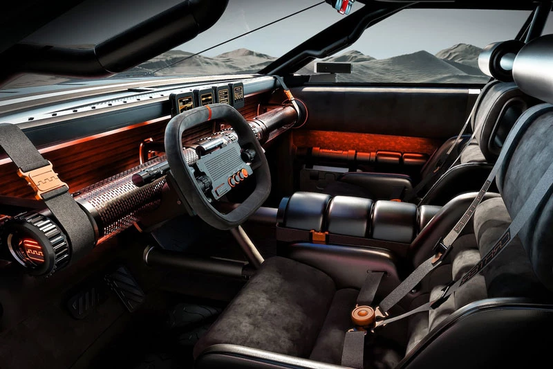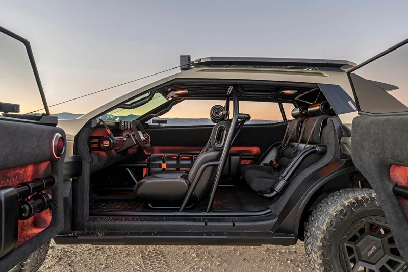Vô-lăng thể thao kiểu xe đua, ghế trước - sau đều kết hợp dây đai an toàn kiểu racing bốn điểm, mang đến không khí đậm chất off-road và tốc độ. Xe còn gây chú ý với thiết kế cửa mở tự sát (suicide door) và khung chống lật trên cột B, tạo nên một cấu trúc tổng thể cứng cáp, an toàn và cực kỳ khác biệt.
