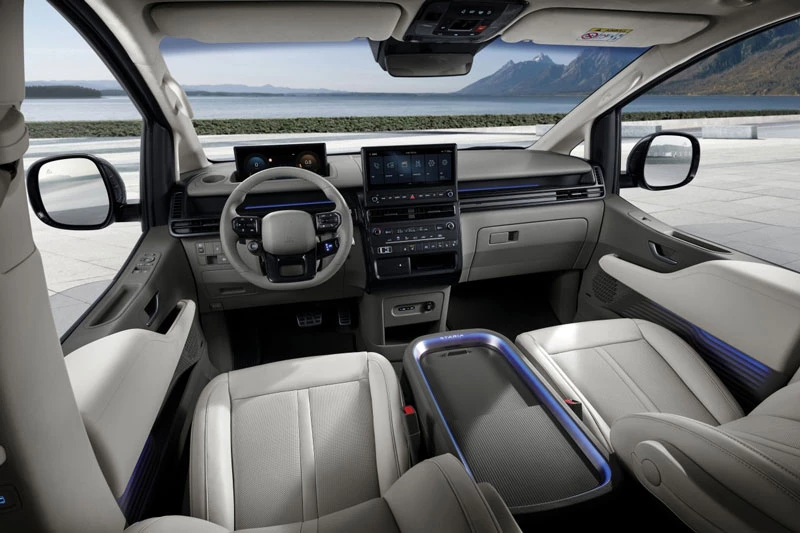 Không gian nội thất của Hyundai Staria 2026 được nâng cấp đáng kể nhằm tối ưu trải nghiệm người dùng. Khoang lái nổi bật với cụm màn hình kép kích thước 12,3 inch, bố trí liền mạch theo phương ngang, giúp tăng cảm giác rộng rãi và hiện đại. Bảng táp-lô được thiết kế lại với các nút điều khiển vật lý dễ thao tác hơn, phù hợp cho cả người lái gia đình lẫn tài xế dịch vụ. Ngoài ra, Hyundai cũng chú trọng cải thiện các hộc chứa đồ và không gian lưu trữ, trong khi phiên bản Lounge được trang bị cần số điện tử dạng cột, giúp giải phóng diện tích khu vực trung tâm và nâng cao sự tiện nghi.