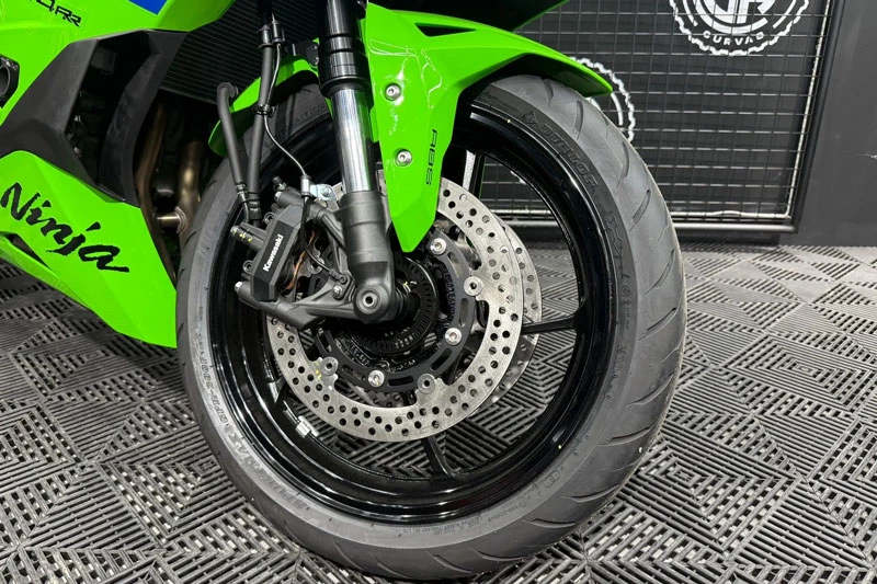 Về khả năng phanh, dòng Ninja ZX-4R được trang bị kẹp phanh kép gắn xuyên tâm bốn piston ở bánh trước, đi kèm đĩa phanh đường kính 290 mm, trong khi bánh sau sử dụng kẹp phanh một piston và đĩa 220 mm. Hệ thống an toàn phanh bao gồm ABS hai kênh KIBS (Kawasaki Intelligent Anti-lock Brake System) cùng công nghệ phanh phối hợp tiên tiến K-ACT, giúp phân bổ lực phanh hiệu quả giữa bánh trước và bánh sau, tăng độ ổn định khi vận hành trên nhiều điều kiện đường sá khác nhau.