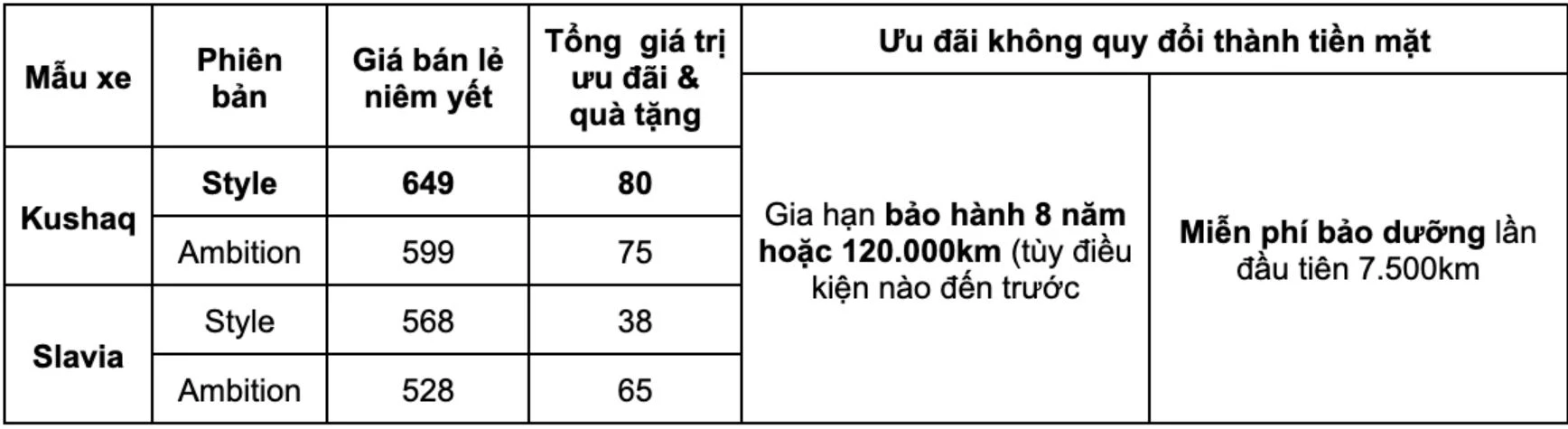 Skoda Kushaq.Theo đó, chương trình khuyến mãi tháng 4/2026 của Skoda không chỉ dừng lại ở việc giảm giá trực tiếp mà còn bao gồm hàng loạt ưu đãi tài chính và quà tặng giá trị, giúp gia tăng trải nghiệm cho khách hàng trong suốt quá trình sử dụng xe. Đáng chú ý, các mẫu xe lắp ráp trong nước như Skoda Slavia và Skoda Kushaq được áp dụng gói ưu đãi tổng giá trị lên đến 80 triệu đồng. Người mua sẽ được hỗ trợ tương đương 50% lệ phí trước bạ, tặng 1.000 lít xăng, ưu đãi 1 năm bảo hiểm vật chất cùng nhiều phần quà đi kèm.