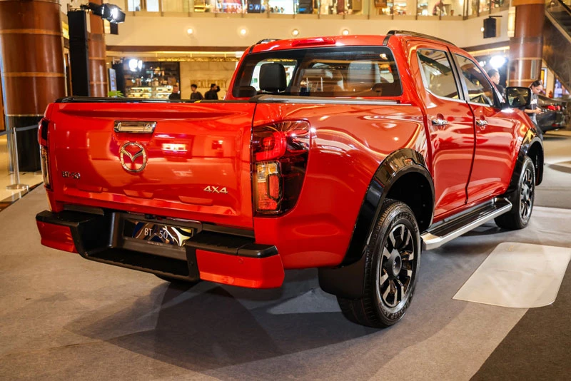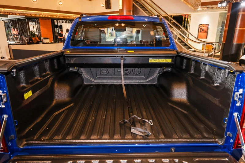 Phía sau, cửa thùng sau được dập nổi rõ nét hơn, đi cùng đèn hậu LED chữ L đồng bộ với thiết kế đầu xe. Logo Mazda được làm lớn hơn, đặt ngay dưới camera lùi trung tâm, tạo cảm giác hiện đại và cân đối hơn so với phiên bản tiền nhiệm.