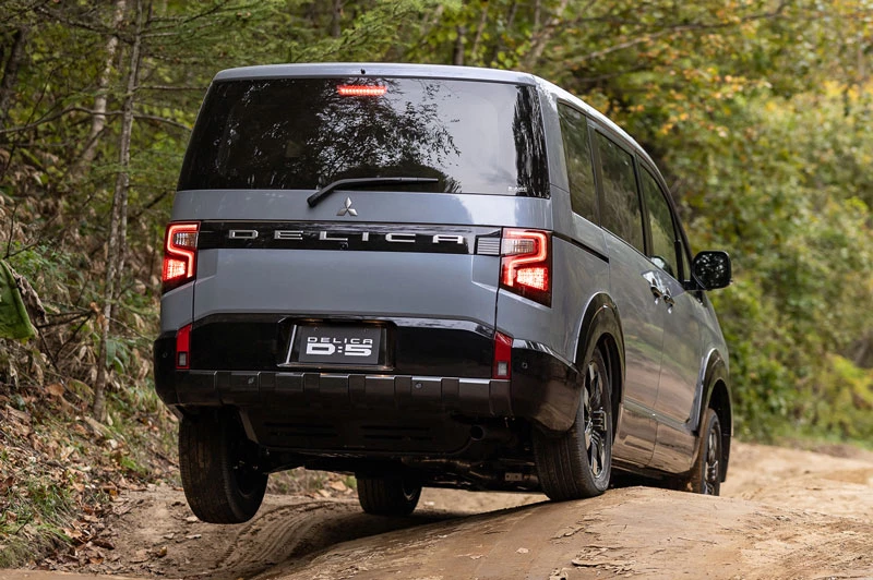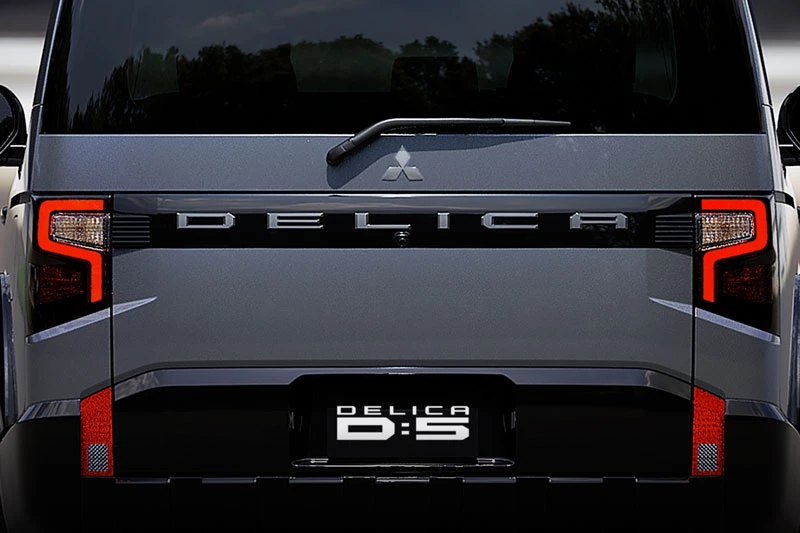 Delica D:5 mới thể hiện rõ cá tính SUV mạnh mẽ ngay từ cái nhìn đầu tiên. Toàn bộ phần đầu và đuôi xe được thiết kế lại, bao gồm lưới tản nhiệt, cản trước và cản sau với tạo hình sắc nét, nhiều lớp, mang lại cảm giác khỏe khoắn nhưng vẫn cao cấp. Các đường viền vòm bánh xe được bổ sung giúp nhấn mạnh hệ thống treo vững chắc và khả năng off-road đặc trưng của Delica. Phía sau xe cũng được làm mới theo hướng gọn gàng và tinh tế hơn, với logo “DELICA” tích hợp vào ốp trang trí cửa hậu, tạo nên vẻ sang trọng nhưng vẫn giữ chất địa hình mạnh mẽ.