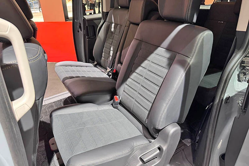 Bên trong khoang lái, nội thất Mitsubishi Delica D:5 2026 được nâng cấp theo hướng hiện đại và thực dụng hơn, đúng tinh thần của một chiếc xe đa dụng dành cho gia đình yêu thích phiêu lưu. Xe được trang bị màn hình hiển thị thông tin màu 8 inch mới, giúp người lái dễ quan sát trong mọi điều kiện ánh sáng. Các chi tiết trang trí kim loại trên bảng điều khiển góp phần tăng cảm giác cao cấp và cứng cáp. Ghế ngồi có thiết kế thể thao, kết hợp da tổng hợp và chất liệu giả da lộn chống thấm nước ở một số khu vực, đi kèm đường chỉ khâu màu kaki, tạo nên tổng thể hài hòa và đậm chất dã ngoại.