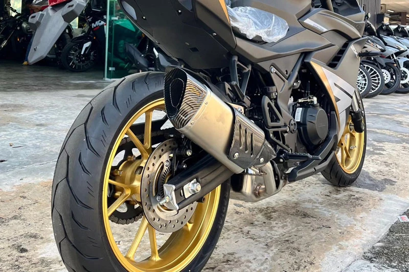 Mẫu sportbike này sử dụng bánh xe kích thước 17 inch cho cả trước và sau, đi kèm lốp 110/70 phía trước và 150/60 phía sau, giúp tăng độ bám đường và ổn định khi vào cua. Xe có chiều cao yên 770 mm, trọng lượng chỉ 130 kg, phù hợp với nhiều đối tượng người lái, cùng bình xăng dung tích 12 lít đáp ứng tốt nhu cầu di chuyển đường dài.