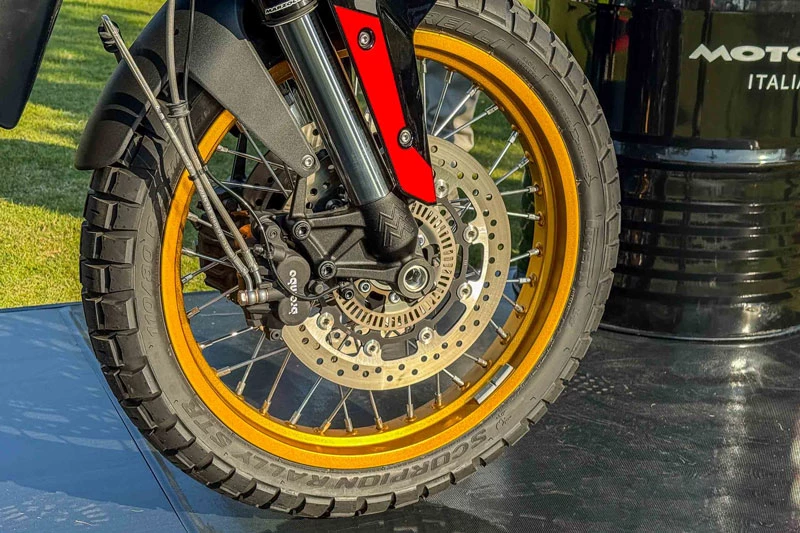 Về an toàn, hệ thống phanh trên xe đến từ Brembo với đĩa đôi 298mm phía trước đi kèm kẹp phanh 4 piston, trong khi phía sau sử dụng đĩa 255mm với kẹp phanh 2 piston. Hệ thống ABS hai kênh là trang bị tiêu chuẩn, đảm bảo an toàn khi phanh gấp. Xe sử dụng mâm nan hoa kích thước 19 inch phía trước và 17 inch phía sau, kết hợp lốp 110/90 và 150/70, phù hợp cho cả đường nhựa và địa hình hỗn hợp.