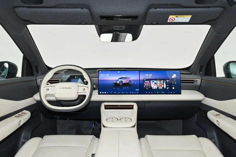 Không gian nội thất của Nissan NX8 được thiết kế theo kiểu buồng lái bao quanh, với 2 tông màu chủ đạo là be và đen. Xe trang bị cụm màn hình hiện đại gồm bảng đồng hồ 10,25 inch, hai màn hình trung tâm 15,6 inch và màn hình HUD thực tế tăng cường (AR HUD) kích thước lên tới 63 inch. Hệ điều hành Nissan OS 2.0 kết hợp chip Qualcomm Snapdragon 8295P mang lại khả năng xử lý mạnh mẽ, hỗ trợ điều khiển giọng nói 4 vùng, đèn nội thất 256 màu và sạc không dây.