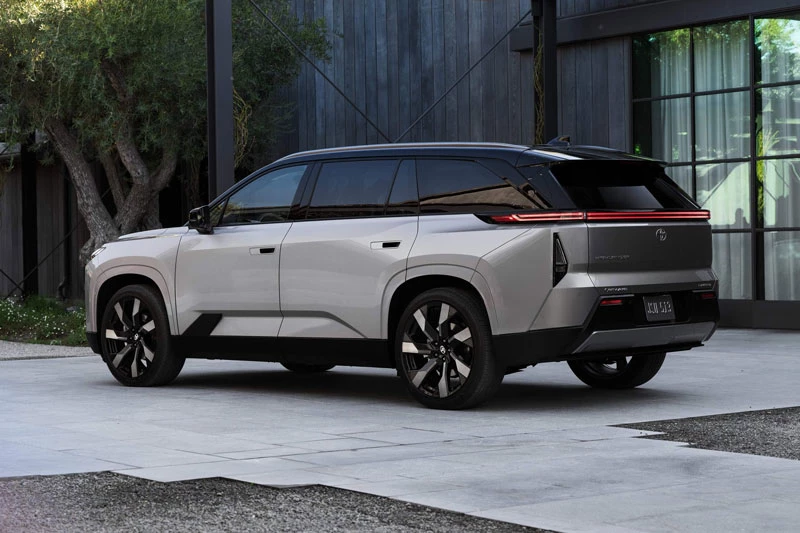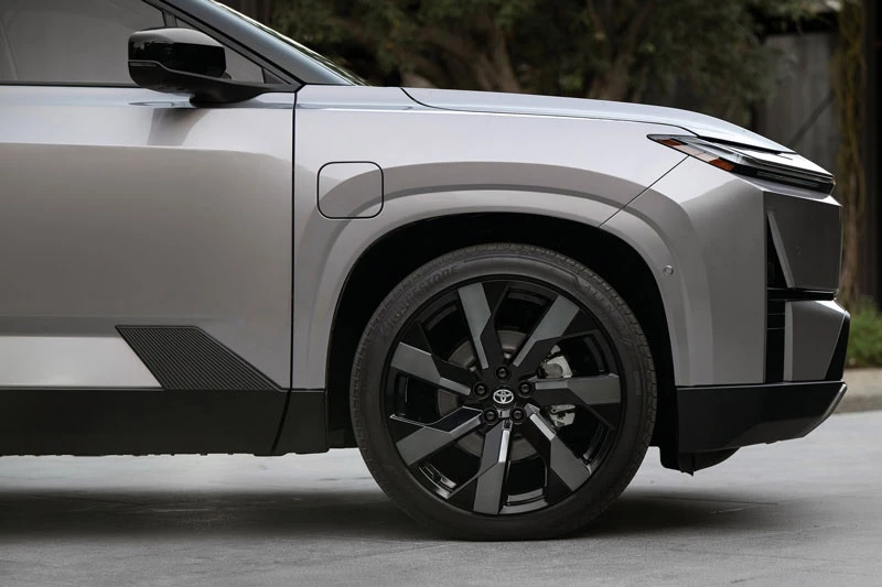 Vòm bánh xe mở rộng và tay nắm cửa bán ẩn góp phần tối ưu hệ số cản gió, đồng thời tạo nên vẻ ngoài thanh lịch nhưng vẫn mạnh mẽ. Toyota đã tinh chỉnh tỷ lệ thân xe bằng cách giảm chiều cao tổng thể, đồng thời tăng chiều rộng và kéo dài chiều dài cơ sở, giúp Highlander EV trông thể thao hơn so với phiên bản động cơ đốt trong.