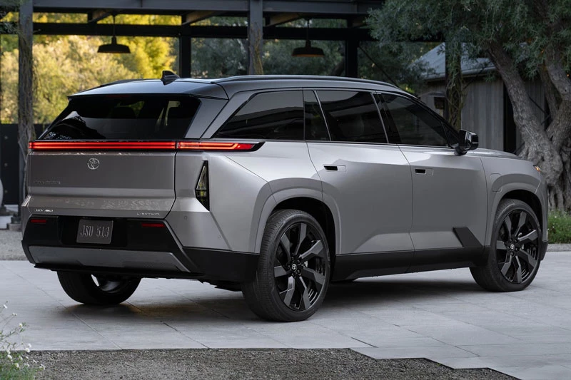 Phần đuôi xe gây ấn tượng với cụm đèn hậu LED kéo dài liền mạch sang hai bên chắn bùn sau, tăng cảm giác bề thế. Toyota Highlander EV có kích thước lần lượt là 5.050x1.989x1.709 mm, chiều dài cơ sở 3.051 mm. So với Toyota Highlander (4.965x1.930x1.750 mm, trục cơ sở 2.850 mm), phiên bản thuần điện mới có kích thước lớn hơn đáng kể, đặc biệt là chiều dài cơ sở, qua đó cải thiện không gian nội thất cho cả ba hàng ghế.