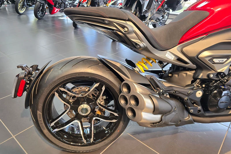 Hệ thống treo trên Ducati XDiavel V4 cũng được đầu tư kỹ lưỡng với phuộc trước USD đường kính 50 mm có khả năng điều chỉnh hoàn toàn và giảm xóc đơn phía sau dạng càng cua. Xe sử dụng bộ mâm hợp kim 17 inch, đi kèm lốp Pirelli Diablo Rosso III, trong đó lốp sau có tiết diện lớn lên tới 240 mm, góp phần tăng độ bám đường và tạo hình ảnh bề thế đặc trưng cho dòng cruiser hiệu suất cao.