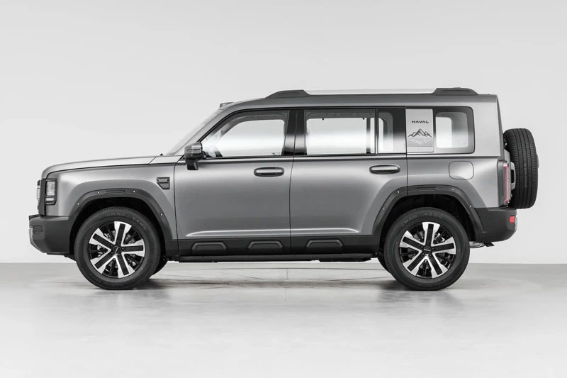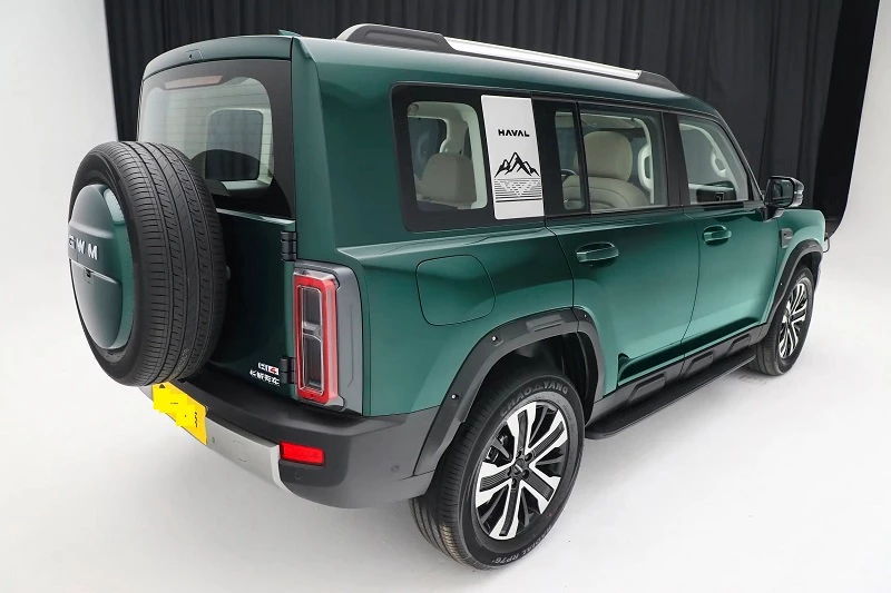 Ở phần thân xe, tay nắm cửa dạng kéo truyền thống kết hợp cùng trụ C thiết kế dày với họa tiết hình núi tạo điểm nhấn mạnh mẽ. Giá nóc được tích hợp sẵn giúp tăng tính linh hoạt khi chở đồ. Phía sau xe mang phong cách đơn giản nhưng cứng cáp, nổi bật với lốp dự phòng treo ngoài, logo GWM đặt phía trên, cụm đèn hậu dạng “mặt trời” độc đáo cùng cản sau phối hai tông màu đen - bạc tạo hiệu ứng thị giác nhiều lớp.