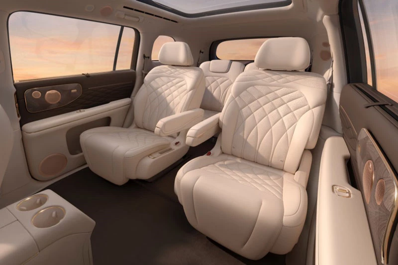 Tiện nghi cao cấp gồm ghế “không trọng lực” hàng hai, tủ lạnh trong xe điều chỉnh nhiệt độ từ -6°C đến 50°C, dàn âm thanh cao cấp B&O, bộ lọc không khí cabin và bộ dụng cụ dã ngoại đi kèm, hướng tới trải nghiệm xa hoa và tiện nghi cho hành khách.