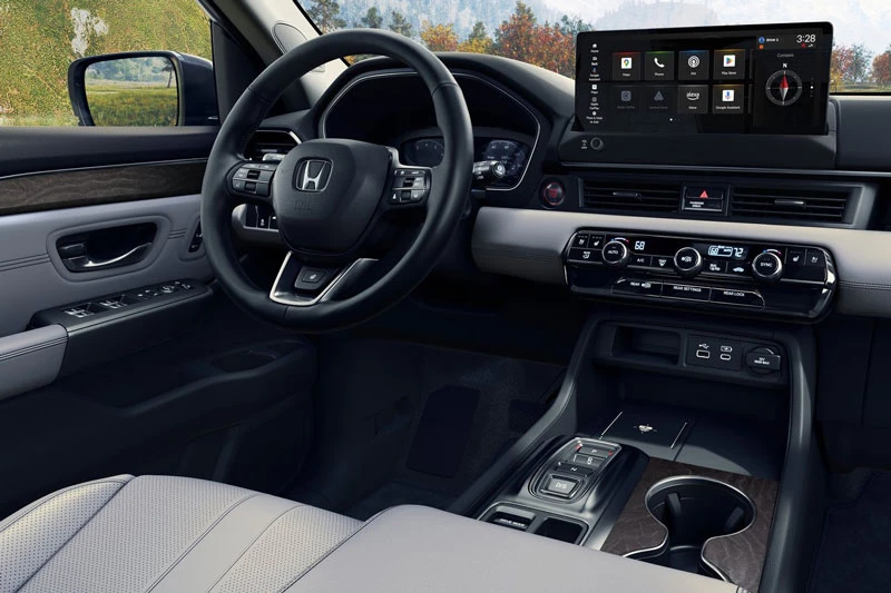 Bước vào nội thất Honda Pilot 2026, người dùng sẽ nhận thấy nâng cấp đáng giá nhất chính là khoang lái kỹ thuật số hoàn toàn, với cụm đồng hồ 10,2 inch đi kèm màn hình trung tâm cảm ứng 12,3 inch lớn hơn nhiều so với đời trước. Hệ thống giải trí được làm mới với giao diện tối giản, Google tích hợp sẵn, Wi-Fi 5G và kết nối Apple CarPlay/Android Auto không dây, tăng sự thuận tiện trong trải nghiệm.
