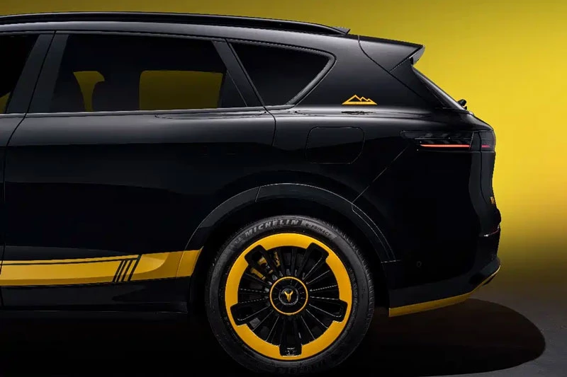 Về thiết kế, Voyah Free+ Sport Custom Edition gây ấn tượng với diện mạo năng động và cá tính. Ngoại thất được phủ lớp sơn đen mờ kết hợp với các chi tiết decal vàng nổi bật ở cản trước, ốp hông, chắn bùn và nắp capo, tạo nên hiệu ứng tương phản mạnh mẽ. Xe được trang bị bộ mâm hợp kim thiết kế ánh sáng động, cùng huy hiệu cột D độc quyền giúp tăng nhận diện thương hiệu và làm nổi bật chất thể thao cao cấp của dòng xe.