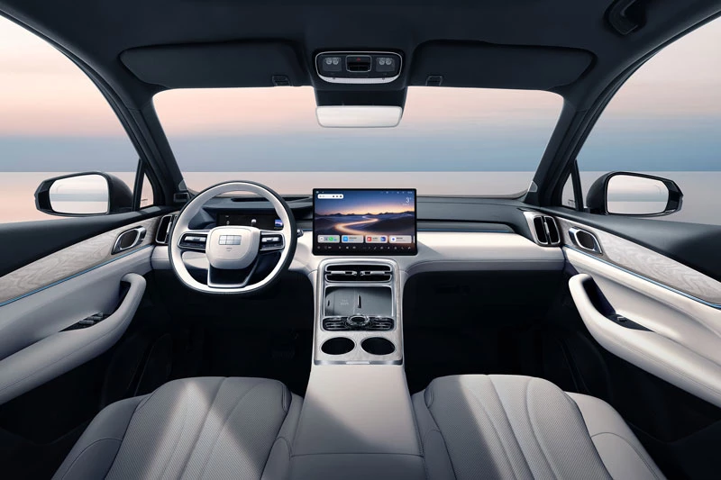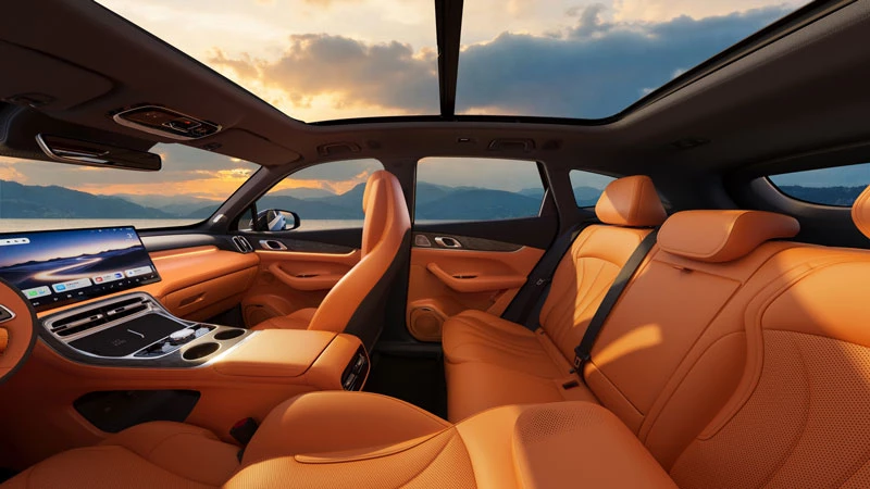 Bên trong khoang cabin, Galaxy M7 2026 gây ấn tượng với hệ thống buồng lái thông minh Flyme Auto 2, vận hành trên nền tảng chip Dragon Eagle-1 tiến trình 7 nm. Trung tâm điều khiển là màn hình cảm ứng độ phân giải cao 15,4 inch, kết hợp cùng trợ lý giọng nói AI Hi Eva cho phép tương tác tự nhiên. Nội thất sử dụng vật liệu da lộn sinh thái kết hợp ốp gỗ tự nhiên, mang lại cảm giác cao cấp. Xe còn được trang bị hệ thống âm thanh Flyme Sound 23 loa, đèn nội thất 256 màu, cửa sổ trời toàn cảnh 1,2 m² và khoang hành lý mở rộng tối đa lên đến 1.990 lít với nhiều ngăn chứa tiện dụng.