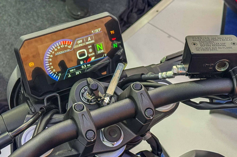 Cụm đồng hồ của Suzuki GSX-8T và GSX-8TT 2026 là màn hình TFT-LCD 5 inch hiển thị màu sắc đầy đủ, cung cấp toàn bộ thông tin vận hành như tốc độ, vòng tua, chế độ lái và mức nhiên liệu. Suzuki tích hợp ba chế độ lái khác nhau gồm Mode A cho phản ứng động cơ mạnh mẽ nhất, Mode B cho khả năng vận hành cân bằng, và Mode C hoạt động như chế độ Rain, giúp kiểm soát tốt hơn trong điều kiện đường trơn trượt.